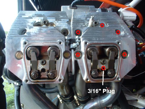 * One of the head bolts is concealed behind a 3/16" allen head plug on each cylinder, see picture above. You will need to screw out the 3/16" plug to gain access to the 1/4" hex head bolt.* Head bolts that require torquing are shown with a red circle on picture, the two middle ones require a 1/2" Socket, the others are all 1/4" Allen dive.